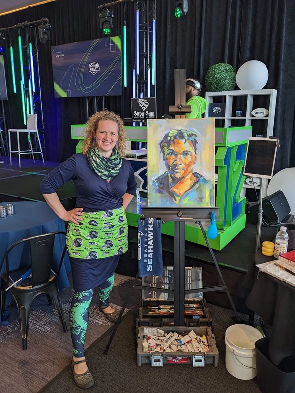 Frida had the pleasure of participating at the Seattle Seahawks local draft event 2022. She painted 45 minute speed portraits of the draft picks live as the draft was taking place. All in all 9 paintings were created. The paintings were later signed by each player and auctioned off as part of the Seattle Seahawks annual charity fundraiser.